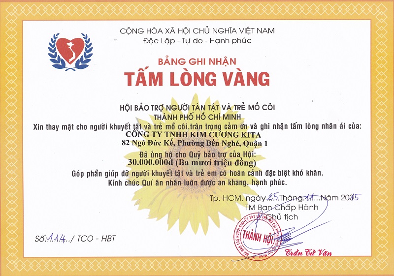 Ngày 25/11/2015 Công ty TNHH Kim Cương KITA nhận bản ghi nhận tấm lòng vàng của hội bảo trợ người tàn tật và trẻ mồ côi thành phố Hồ Chí Minh